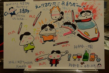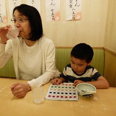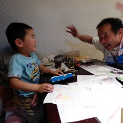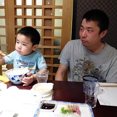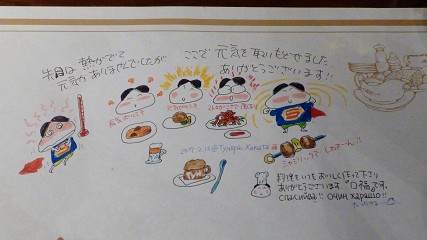 夜は一番街「魚庄」。としくんはお絵かき。