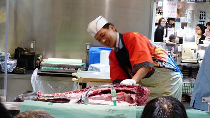 食べたら、岡山高島屋の地下で、まぐろの解体ショー。威勢がいいね。