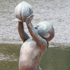 水辺の桃ちゃんと岡山城。