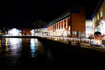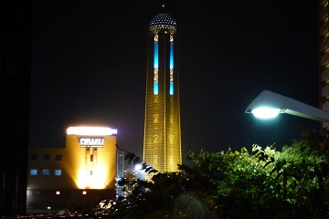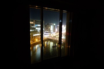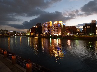 夜の新天町の飾りと、ホテルの窓からの中州風景