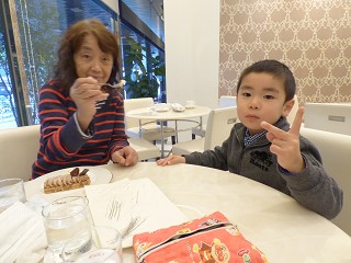 けんちゃんたちが買い物の間、城山ホテルのロビーで遊ばせ、そのあとケーキ (*^_^*)